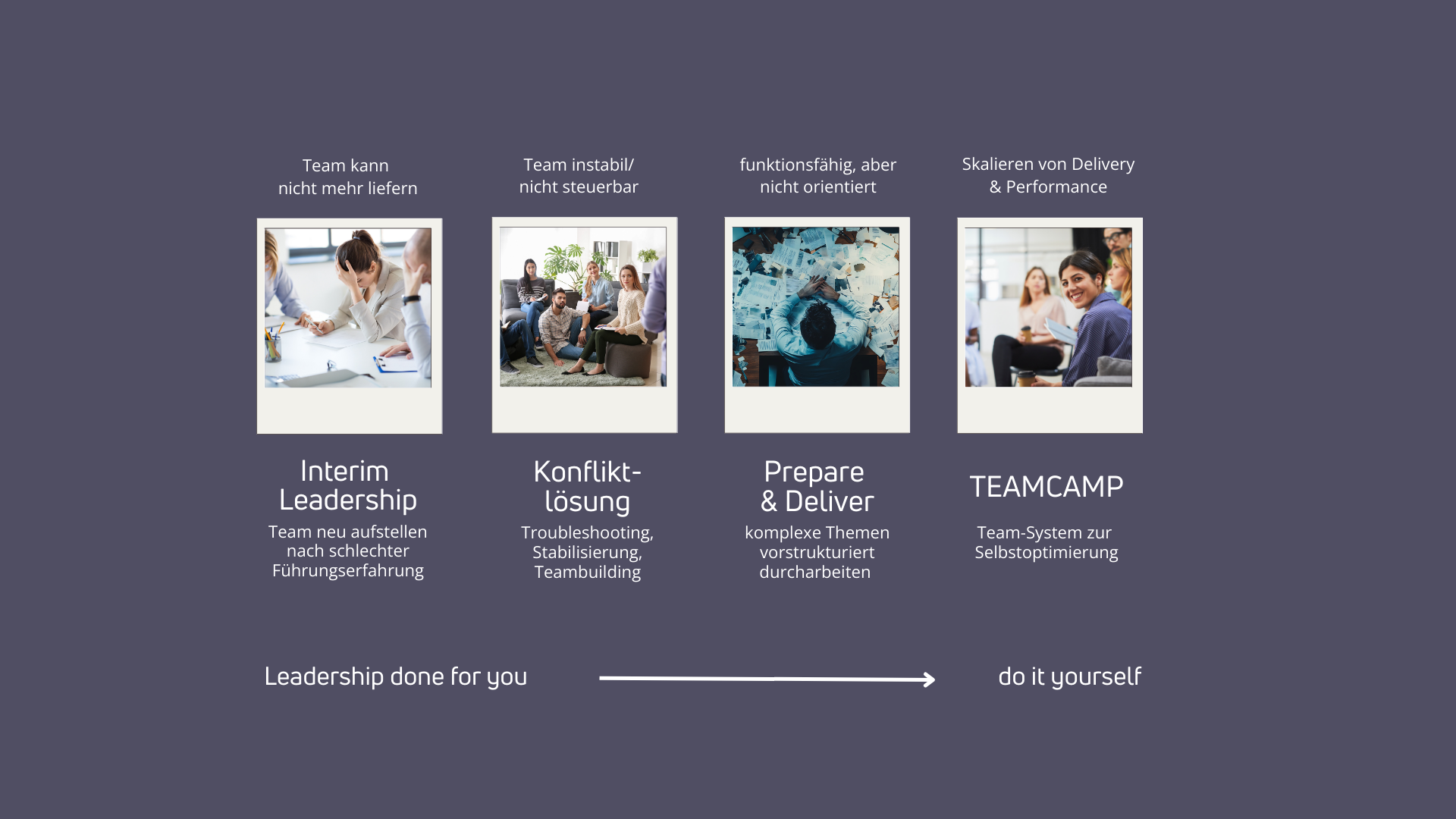 Je nachdem, wie fordernd die Ausgangslage ist, übernehme ich persönlich vor Ort die Führung für Teams mit Leadership Gap, interveniere bei starken Spannungen mit einer erprobten Struktur, gebe Führungskräften und Teams Tools an die Hand, um ihre Performance selbstwirksam zu optimieren, bis zum autonomen Skalieren von Performance-Optimierung.